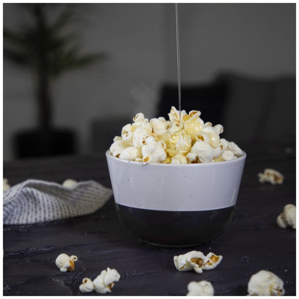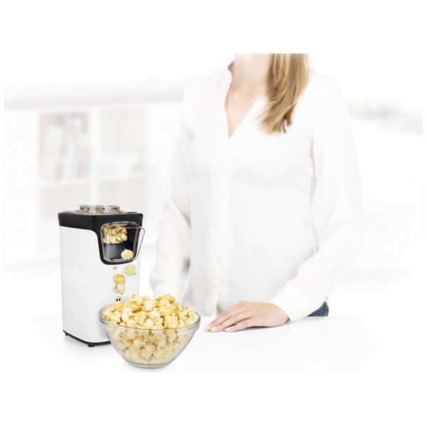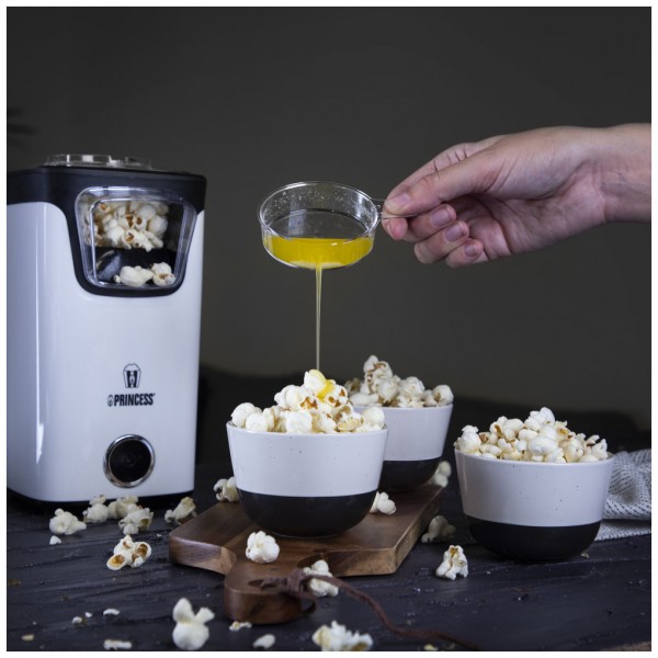 A través de la tapa transparente, puede ver cómo los granos se convierten en palomitas de maíz. ¡Sus hijos quedarán fascinados! Utilice la taza medidora para saber cuántos granos debe meter y, en cuanto se conviertan en palomitas, podrá añadir más a través de la apertura para rellenado sin necesidad de apagar la máquina de hacer palomitas. La taza medidora también se utiliza para medir mantequilla derretida. Obtendrá unas palominas un poco menos sanas, pero muy sabrosas.Elija su sabor preferido