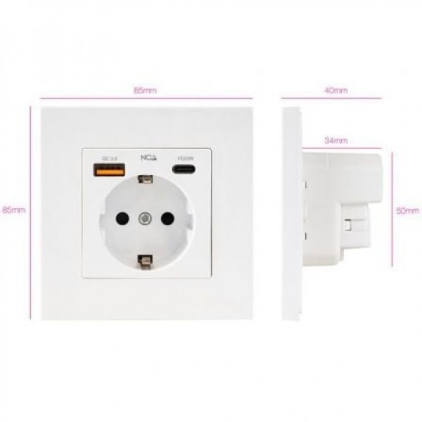 Base de enchufe de pared tipo schuko con 2 tomas USB: USB-A con QC 3.0 y otro USB-C con PD, 20W