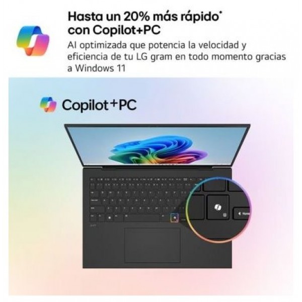 - Hasta 50 TOPS de potencia al servicio de la IA. Equipado con el procesador AMD Ryzen™ AI 7, LG gram integra 3 AIs avanzadas: Chat On-Device sin conexión, Chat Cloud basado en GPT-4o y Copilot+ PC. Más rendimiento y eficiencia en un equipo portátil y ligero.