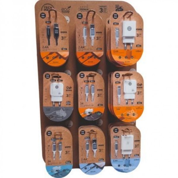 Elegante expositor de peana TECH ONE TECH, con 9 ganchos y 3 productos en cada gancho, total 27 productos de cargadores y cables más vendidos.