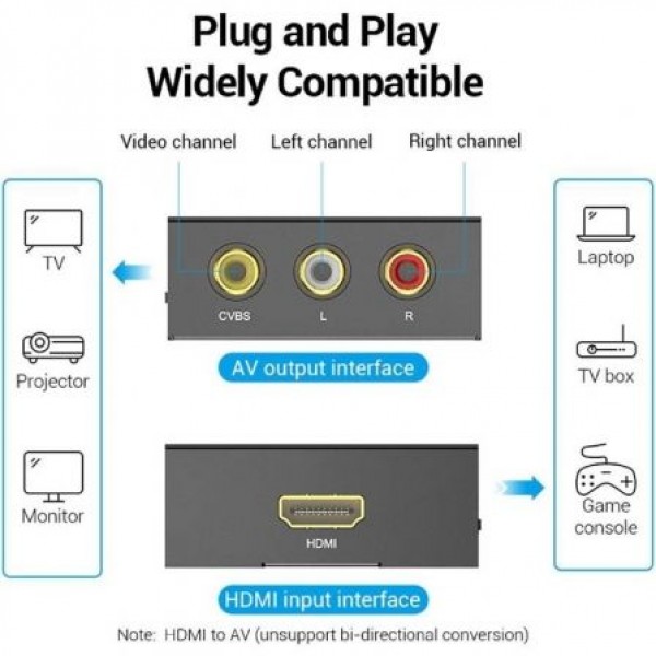 Puede usar el convertidor de señal HDMI a analógico simple y fácil de usar , por ejemplo, al conectar un televisor moderno con un sistema de cine en casa que tiene una entrada compuesta. El convertidor está hecho de aleación de aluminio.- Conversor de señal HDMI a señal compuesta y sonido estéreo