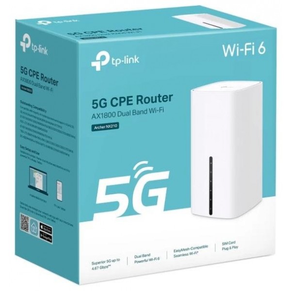 | Hardware | Interfaz - 2 x puertos LAN Gigabit - 1 x puerto LAN/WAN Gigabit - 1 x ranura para tarjeta nano SIM - 2 x puertos SMA para antenas externas 5G/4G - 1 x puerto de alimentación Antenas - 2 × antenas Wi-Fi internas - 8 × antenas internas NR/LTE Botones - Wi-Fi/RESET Button, Power Button, WPS Button |