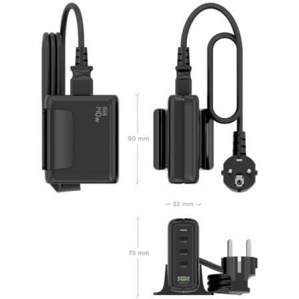 - Cargador de sobremesa GaN USB-C PD3.1 de 140W. Carga rápidamente portátiles, móviles, tablets, cámaras u otros dispositivos. Su diseño de sobremesa ofrece un acceso cómodo y rápido a los puertos USB.