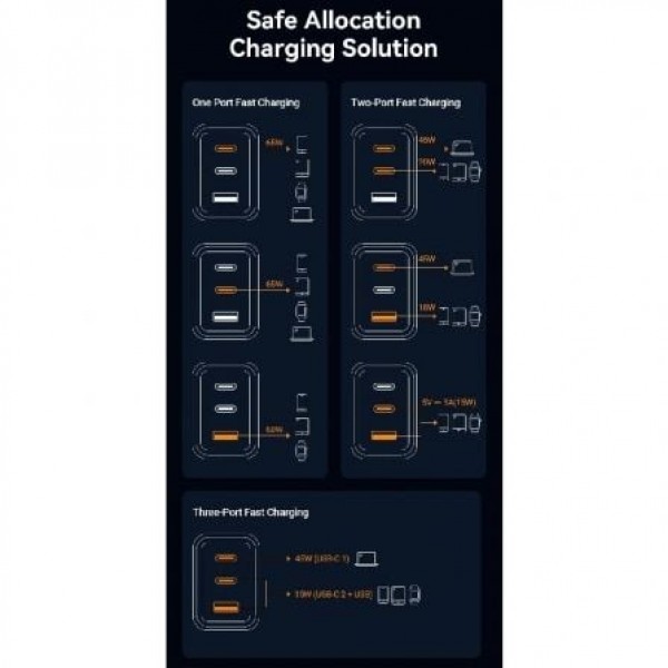 Cargador GaN de 3 puertos USB (C + C + A) (65W/65W/60W)
