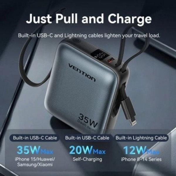 Vention Mini banco de energía de 10000 mAh (USB-C + USB-C/Lightning) con cables USB-C y Lightning integrados, 35 W, gris