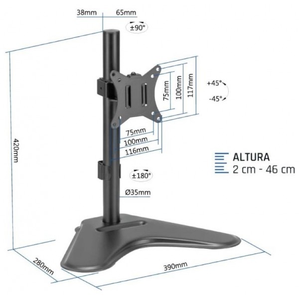 | Caracteristicas | - Soporte de sobremesa para 1 monitor - Tamaño de monitor soportado: 13" (mín) - 32" (máx) VESA mínimo: 75 x 75 mm VESA máximo: 100 x 100 mm - Peso máximo soportado: 8 kg - Ajustable en altura, inclinación, rotación y giro: Altura: 2 cm ~ 46 cm Inclinación: +45° ~ -45° Rotación: +180° ~ -180° Giro: +90° ~ -90° - Color: Negro - Peso neto: 2,8 kg - Base sólida y estable - Sistema integrado de guiado de cables y almacenamiento de llaves Allen - Incluye manual, tornillería e instrucciones de instalación - Cumple especificaciones RoHS |