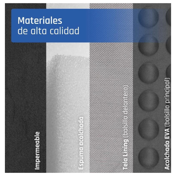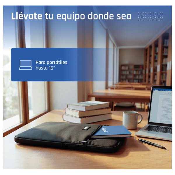 | Características | - Funda acolchada para portátiles o tablets - Admite tamaño de hasta 16" - Interior acolchado con burbujas de impacto - Medidas: 40,5 alto x 29 ancho cm - Profundidad: 2 cm - Un compartimento central de 28 alto x 26,5 ancho cm - Material: poliéster - Color: negro - Peso: 300 g |