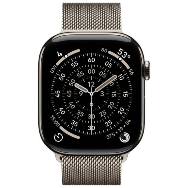 - Tamaño y peso: Alto: 46 mm, Ancho: 39 mm, Grosor: 9,7 mm, 416 x 496 píxeles, Superficie de pantalla de 1.220 mm², Peso (aluminio, GPS): 37,8 g, Peso (aluminio, GPS + Cellular): 36,9 g, Peso (titanio): 43,1 g, Para muñecas de 140 a 245 mm