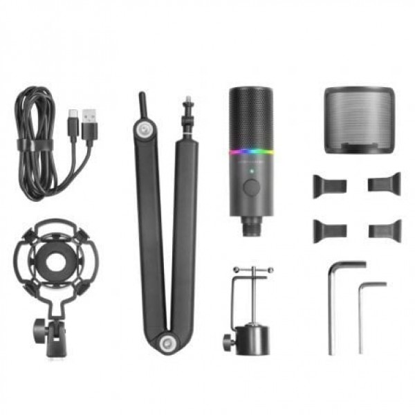 Da el salto profesional definitivo con el MMIC-XT. Un micrófono de estudio de alta definición (ADC 192 kHz) con iluminación DYNAMIC ARGB RING, brazo mecánico sólido y ajustable omnidireccional, soporte antivibración, filtro antipop de malla metálica y entrada Jack de auriculares sin latencia. Conexión USB plug & play y construcción completamente de metal para una durabilidad extrema.. . Características principales:. . KNOB DE CONTROL INTELIGENTE. Personalización total gracias al knob de control inteligente que te permite elegir entre diferentes modos de audio y ajustar la ganancia del micrófono:. 1. CARDIOIDE: para un sonido claro y direccionalmente enfocado, perfecto para transmisiones, grabación de instrumentos y grabaciones de voz. 2. REDUCCIóN DE RUIDO: elimina activamente el ruido externo y las interferencias, proporcionando una grabación limpia y nítida. 3. MODO MUTE: silencia el micrófono de forma rápida y visual gracias al indicador led inteligente. 4. GANANCIA DEL MICRóFONO : ajusta la sensibilidad del micrófono para capturar audio al nivel perfecto, asegurando que sus grabaciones sean nítidas y equilibradas. . BRAZO MECáNICO REGULABLE OMNIDIRECCIONAL. El brazo mecánico sólido premium ajustable permite un posicionamiento perfecto en cada circunstancia de grabación, brindando la flexibilidad necesaria para colocar el micrófono exactamente donde necesites.. . SOPORTE CON AMORTIGUADOR ANTIVIBRATORIO. Soporte con choque antivibración profesional para un aislamiento efectivo del micrófono del ruido y las vibraciones no deseados, lo que lo convierte en el accesorio indispensable para cualquier configuración de grabación profesional.. . FILTRO POP DE MALLA METáLICA. Reduce de manera efectiva la distorsión de los sonidos oclusivos y la sibilancia, lo que hace que el audio sea más natural y limpio gracias al filtro pop de malla metálica.. . TOMA DE AURICULARES SIN LATENCIA. Escucha tu voz o música a través del micrófono en tiempo real con sus auriculares conectados al puerto jack de 3,5 mm para un control máximo.. . ILUMINACIóN DYNAMIC ARGB RING. Experimenta la impresionante iluminación Dynamic ARGB RING con efectos visuales personalizables que se pueden controlar fácilmente con el sensor táctil. Agrega un toque de estilo a tus streamings o grabaciones para que sean mucho más atractivas. . MATERIALES PROFESIONALES. Micrófono y soporte totalmente metálicos construidos con los mejores materiales para una máxima durabilidad y estabilidad para mantener el micrófono seguro.. . Especificaciones:. . Diagrama polar: Cardioide y Omnidireccional. SPL: 120dB. Sensibilidad: -35dB±3dB. Rango de frecuencias: 20Hz-20kHz. Conector: USB (Micrófono) / Jack 3.5mm (Auriculares). Longitud del cable: 200cm. Iluminación: Indicador LED de estado y 8 modos de iluminación RGB Chroma. Impedancia: >;16Ω. Compatibilidad: Windows, Mac, PS4, PS5, *iPadOS, *Android (*adaptador OTG no incluido). Dimensiones: 165x65x50mm (micrófono) / 790x60x25mm (brazo)