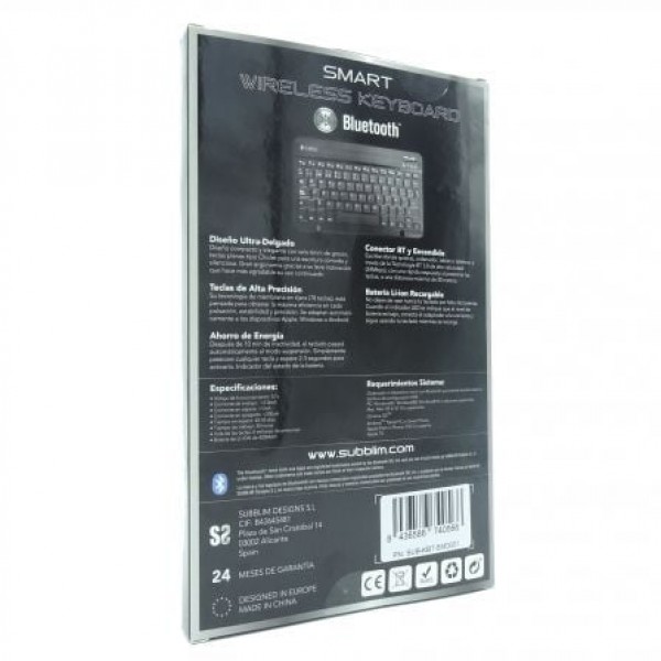 SMART BT es el teclado ultrafino y ultraligero para escribir cuando quieras. Combínalo con tu teléfono, tablet o centro multimedia favorito gracias a la conectividad Wireless Bluetooth 3.0 para tener infinitas posibilidades y trabaja en cualquier sitio.Diseño Ultra-DelgadoDiseño compacto y elegante con solo 6mm de grosor que permite el uso en cualquier espacio y momento. Cabe fácilmente en un bolso, maletín o mochila... e incluso entre las páginas de una revista. Es tan ligero que hasta podrías olvidar que lo llevas contigo.Teclas de Alta PrecisiónSu tecnología de membrana en tijera, está pensada para obtener la máxima eficiencia en cada pulsación, estabilidad y precisión. La teclas son planas de tipo Chiclet para una escritura cómoda y silenciosa.Batería Li-ion RecargableCuando el indicador LED te indique que el nivel de batería es bajo, conecta tu dispositivo por USB a una fuente de corriente y sigue usando tu teclado mientras se recarga gracias a su Batería de Li-ion de larga duraciónAhorro de EnergíaDespués de 10 min de inactividad, pasará automáticamente al modo suspensión para conservar las baterías. Simplemente presione cualquier tecla y espere 2-3 segundos para volver a activarloConector BT y Encendido