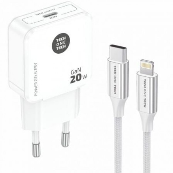 Cargador ultrarrápido con tecnología GaN Power Delivery 3.0 (PD) 20W, color blanco. Carga hasta un 400% más rápido que un cargador estándar de 5W. Compatible con dispositivos anteriores. Conector tipo Apple lightning de 3A. Este cargador permite cargar dispositivos como tabletas, móviles, consolas, baterías, auriculares, etc.