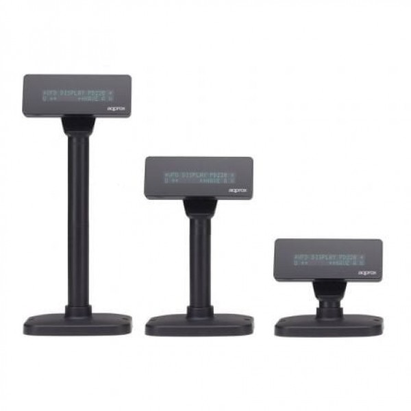 Visor de cliente alfanumérico fluorescente al vacío.. Visor de cliente para punto de venta, de 20 caracteres y 2 líneas, ideal para informar al cliente del los datos más relevantes del proceso de compra, marcando unidades y precios de los productos a medida que pasan por el lector de códigos.. El visor appVFD01 destaca por su funcionalidad y adaptabilidad a diferentes entornos, permitiendo una configuración a tres alturas y una rotación del cabezal máxima de 355º.. Especificaciones:. • Visualización: Pantalla fluorescente al vacío. • Nº de caracteres: 40 (20 columnas x 2 líneas). • Brillo: 500 - 1.000 cd/m2. • Tipo de carácter: 95 Alfanuméricos, 32 caracteres internacionales. • Tamaño del carácter: 6.7 (H) x 3.7 (W) mm.. • Tamaño del punto (X x Y): 0.80 x 0.70 mm.. • ángulo de visión: Max. 60º. • Rotación horizontal: Max. 355º. • Modo de comandos: LD220, EPSON POS D101, AEDEX, UTC/S, UTC/P, ADM788, DSP800, CD5220, EMAX, LOGIC CONTROL. INTERFAZ. • USB. GENERALES. • Conexión: 9.600 o 19.200 bps. • Tiempo medio de vida: 30.000 horas. • Consumo: 5-24 VDC. • Dimensiones: 169,5 x (Altura variable de 273 a 400) x 98,5 mm.. • Peso: 800g.. • Color: Negro. • Incluye: Cable USB